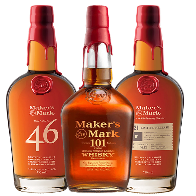 Don't miss the chance to elevate your bourbon whiskey experience. Shop the Maker's Mark 101, Maker's Mark 46, and Maker's Mark Wood Finishing Bourbon Whisky Bundle at VS Liquor today.
